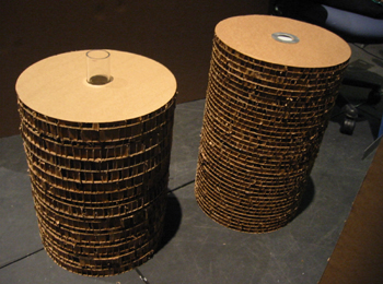 These cardboard stools were a spontaneous bi-product and, well known to many students, a good means for procrastination. Their making was inspired by the many pieces left-over from cutting cardboard for the tables. I cut 12" cardboard rings on the laser cuter and placed them one on top of the other. I used a plexi tube as a stacking rod. I made a small, battery-operated circuit with ultra-bright LED, and placed it inside the tube. Aluminium rings with vellum glued on plexi was placed on top of the plexi tube. The vellum is translucent and diffuses the light.