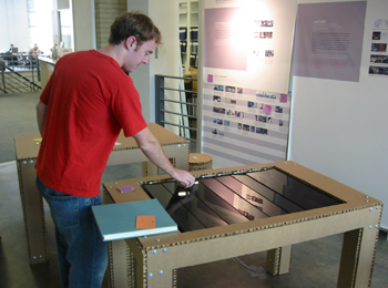 Student playing with the Steal Table at MIT Rotch library.